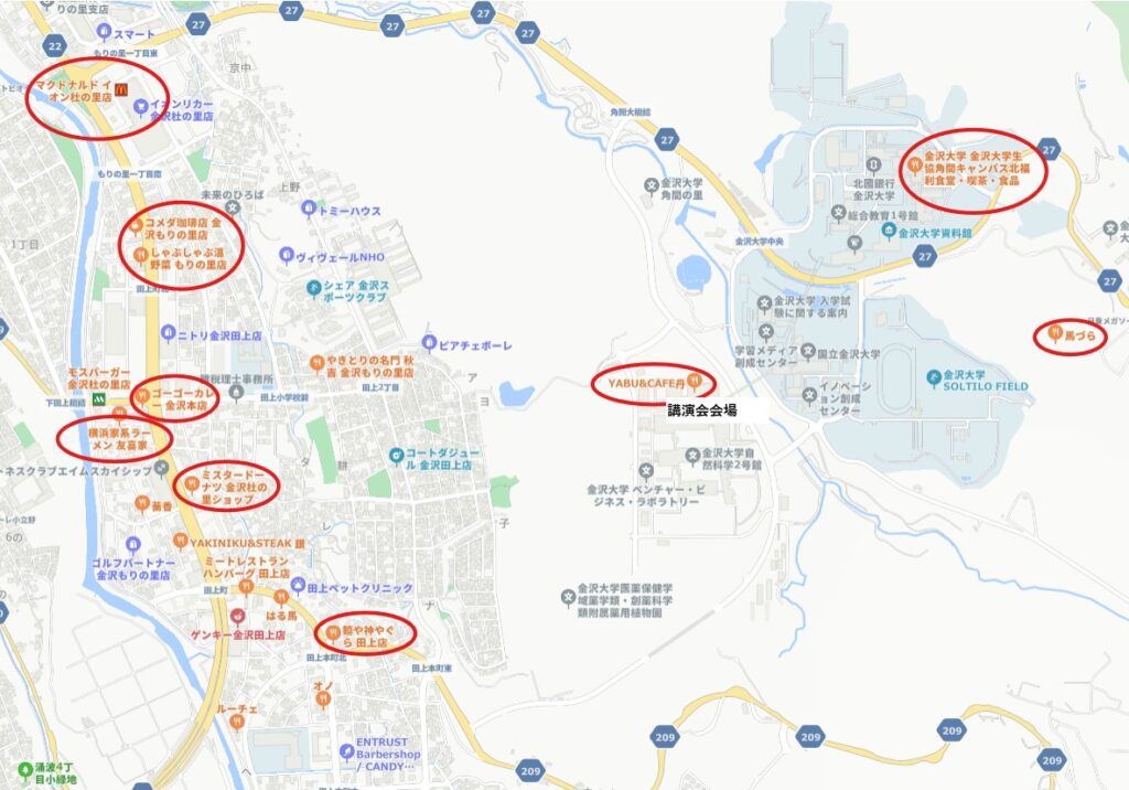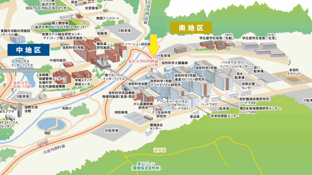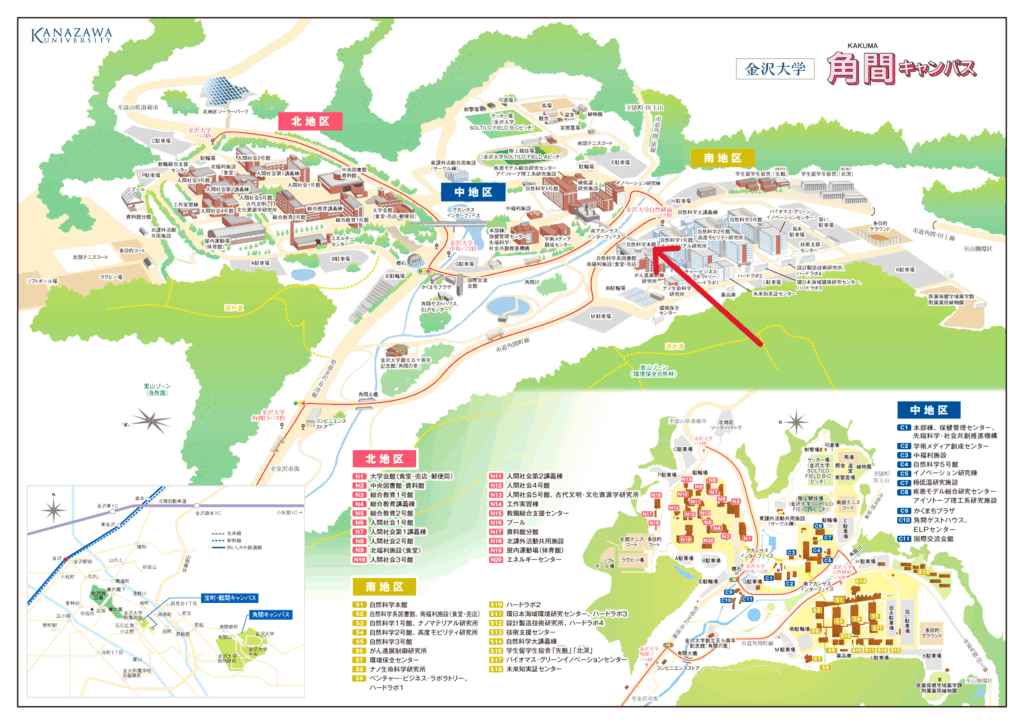 会場案内【更新】 会場案内 講演会会場 キャンパスマップ 特別講演会・表彰式会場 食事処マップ 懇親会会場 講演会会場 金沢大学 自然科学本館(金沢市角間町) 金沢市へのアクセス ・JR利用 東京-金沢 北陸新幹線 2時間29分・飛行機利用 ※小松空港-金沢駅連絡バスがある。 小松⇔羽田:1時間、小松⇔福岡:1時間半、小松⇔札幌:1時間半強 金沢駅からキャンパスまでのアクセス(北陸鉄道路線バス利用の場合) 金沢大学自然研前バス停下車: 金沢駅兼六園口(東口)8番乗り場発 [93][94][97]金沢大学行き(兼六園下経由) キャンパスマップ 角間キャンパスマップ(全体図)PDF 自然科学本館へのアクセス詳細 特別講演会・表彰式会場 石川県立音楽堂邦楽ホール (石川県金沢市昭和町20番1号) 食事処マップ 懇親会会場